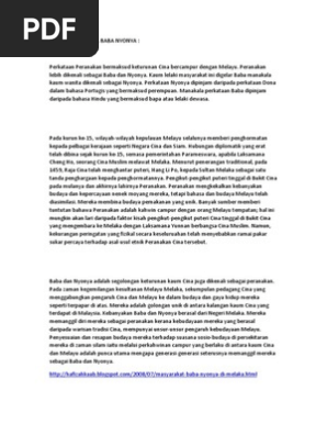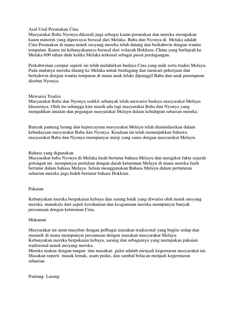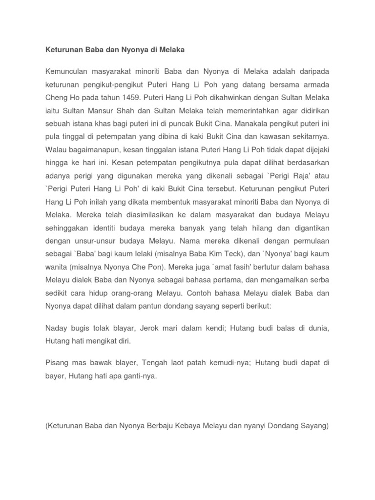 Keunikan Masyarakat Baba Dan Nyonya from imgv2-2-f.scribdassets.com Masyarakat peranakan baba dan nyonya merupakan kumpulan komuniti yang tinggal di negeri melaka. Uniknya, bahasa mereka tiada pertambahan suku kata. Nur syazreen binti mohd juraina tingkatan: Asal usul baba dan nyonya. Tan ah meng 1 year ago. Sejarah, asal usul dan peradaban suku batak. Masyarakat baba dan nyonya sememangnya terkenal di melaka. Bagaimanapun, sebahagian mereka enggan mengakui bahawa mereka adalah.